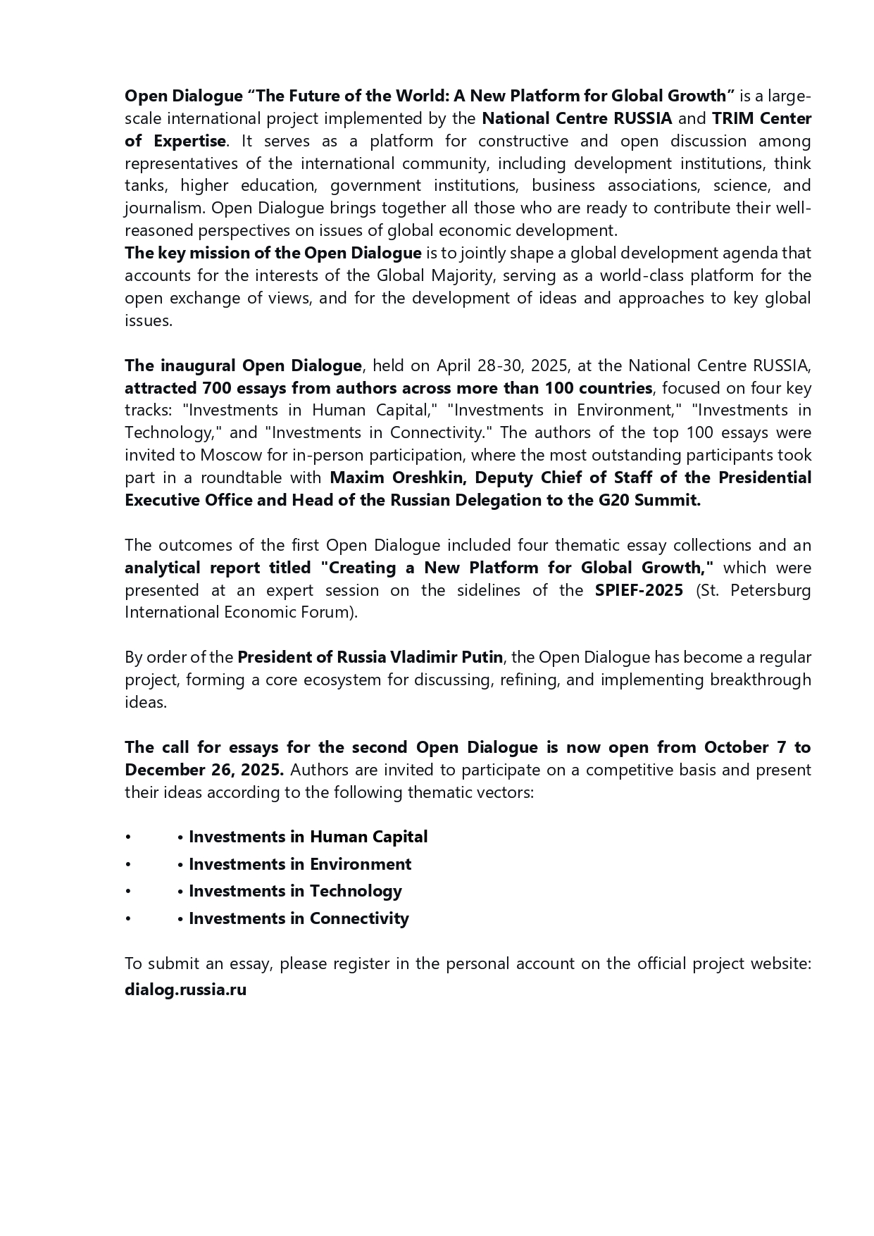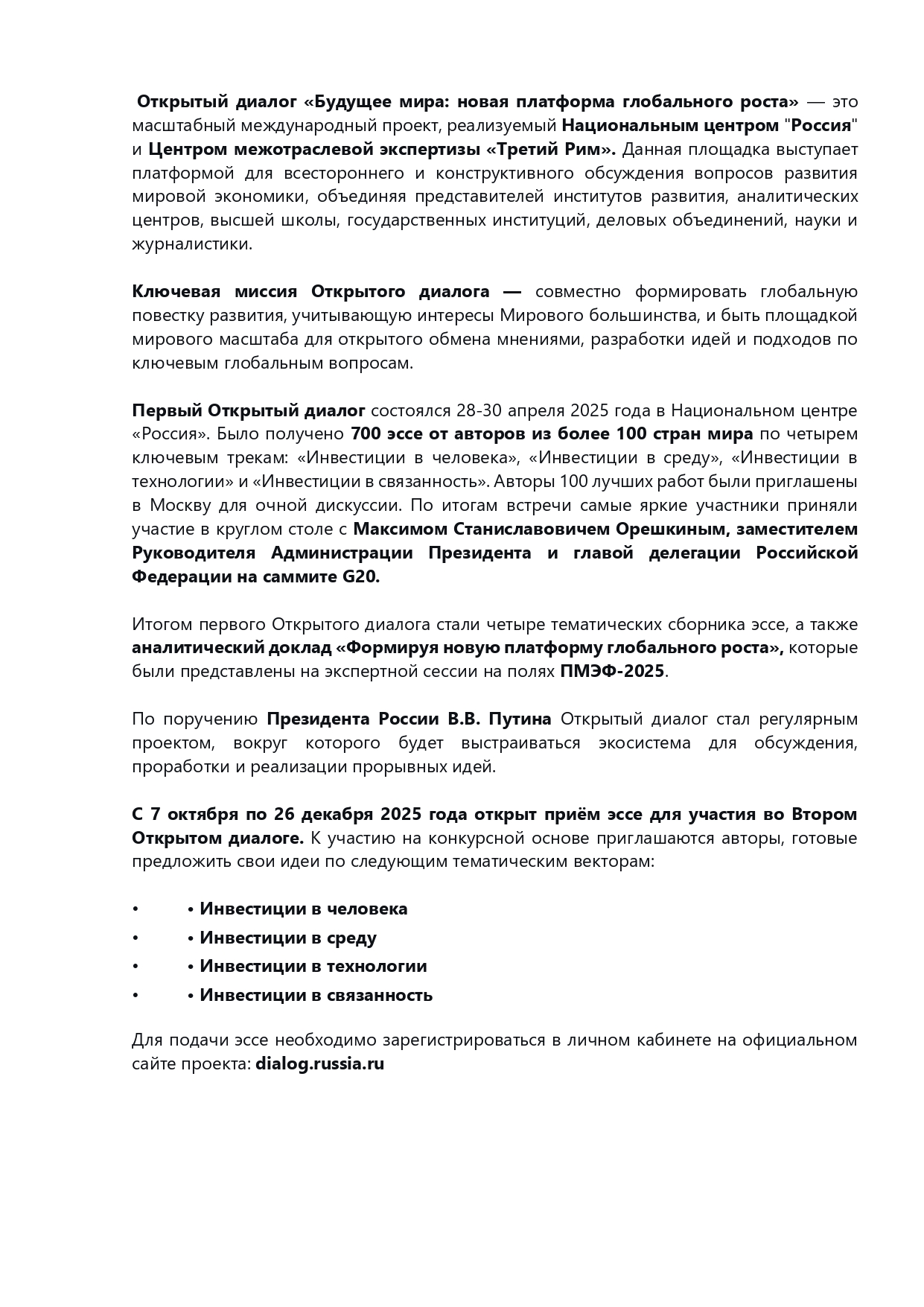 전문가위원회의 심사를 거쳐 최종 명단에 오른 우수 에세이의 저자들은 2026년 4월 모스크바에서 개최되는 오픈 다이얼로그에 직접 참가할 기회를 얻게 됩니다. 최종 우승자는 2026년 6월 3~6일 개최되는 #SPIEF를 비롯한 주요 국제 경제 포럼에 참가할 수 있게 됩니다.