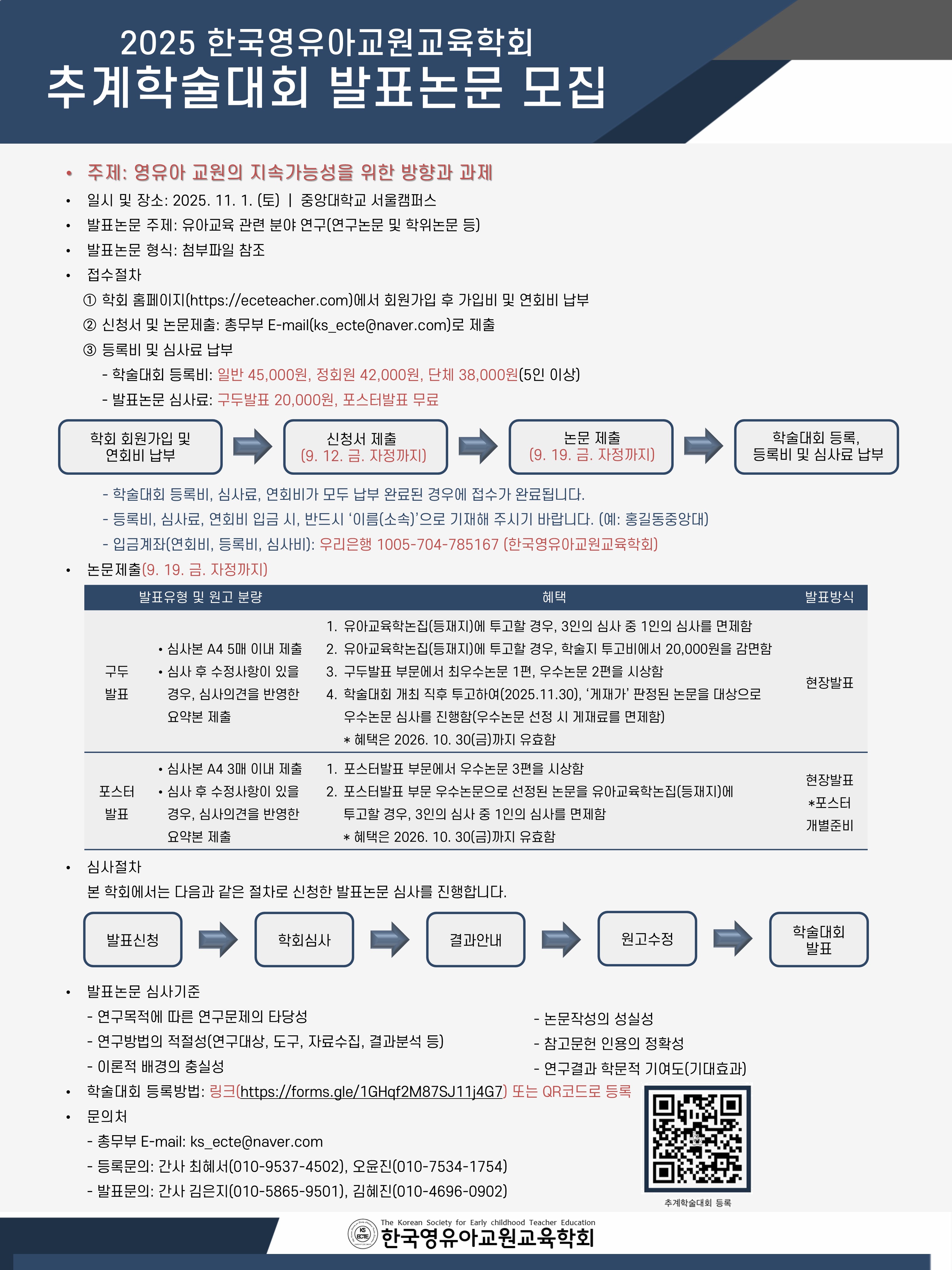 [한국영유아교원교육학회] 2025 추계학술대회 원고모집 및 일정안내