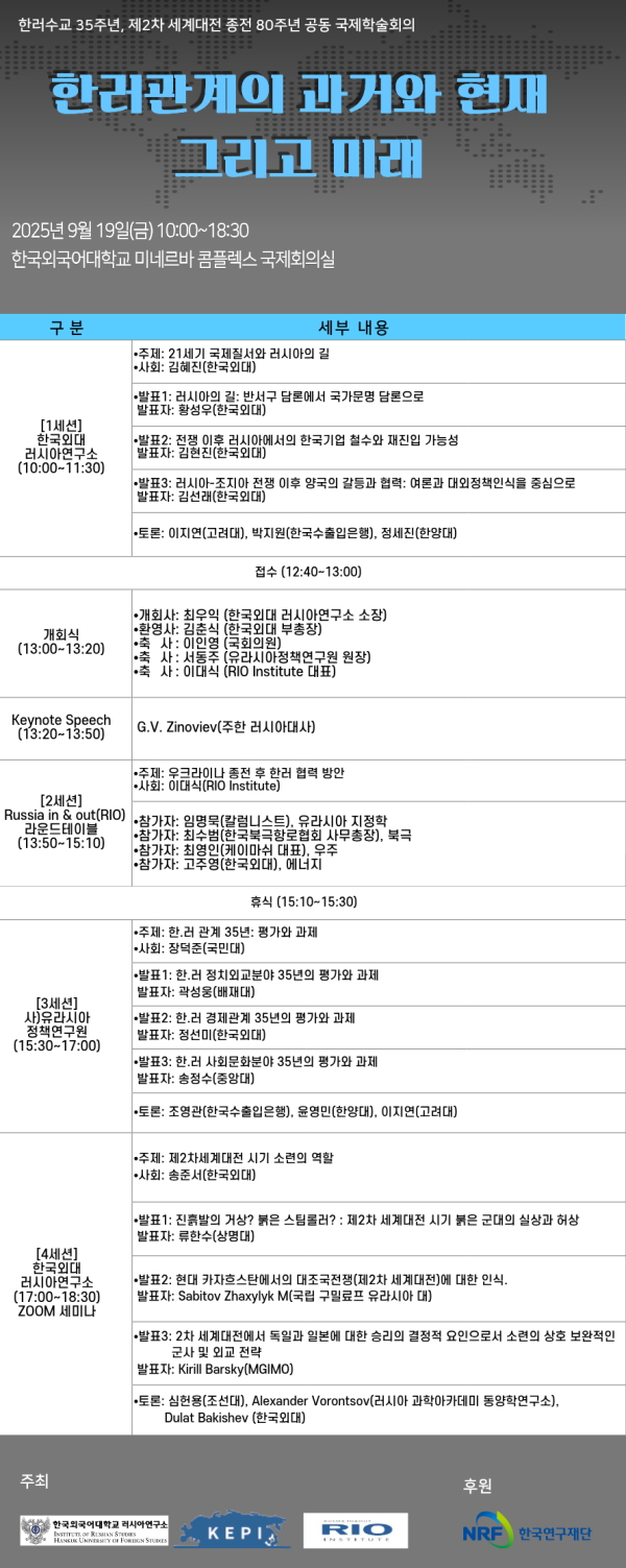 최우익 러시아연구소장은 “급변하는 국제 정세 속에서 한러 관계의 과거를 성찰하고 미래 협력의 지혜를 모으는 이번 학술회의가 학문적 교류를 넘어 실질적 협력 방안을 제시하는 계기가 되길 바란다”고 밝혔다.