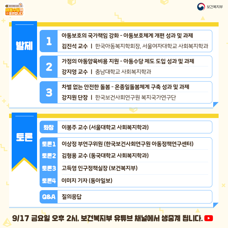 ‘아동복지정책 진단과 발전을 위한 좌담회’가 9월 17일 오후 2시에 개최됩니다.