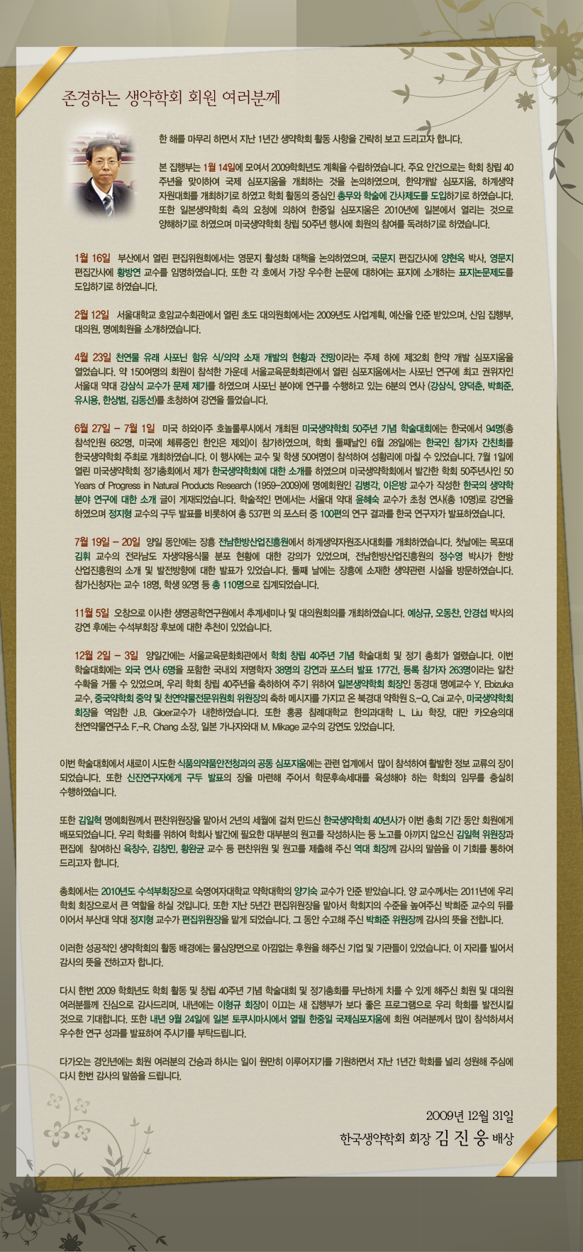 생약학회 회원 및 대의원께 2009학회년도 활동 보고를 첨부하여 보내드립니다. 회원님 모두에게 희망찬 새해가 되기를 기원합니다 한국생약학회 회장 김 진 웅 배상