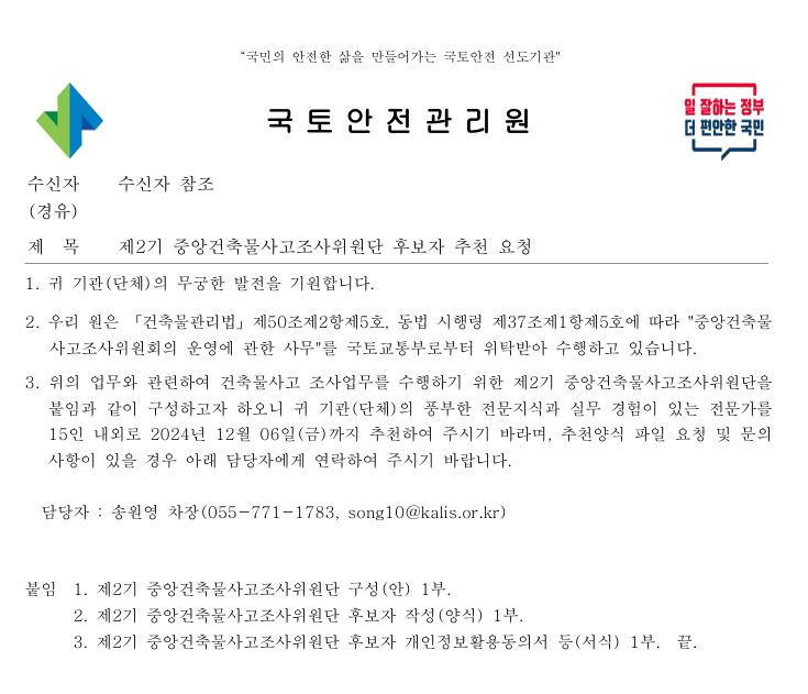 [국토안전관리원]제2기 중앙건축물사고조사위원단 후보자 추천