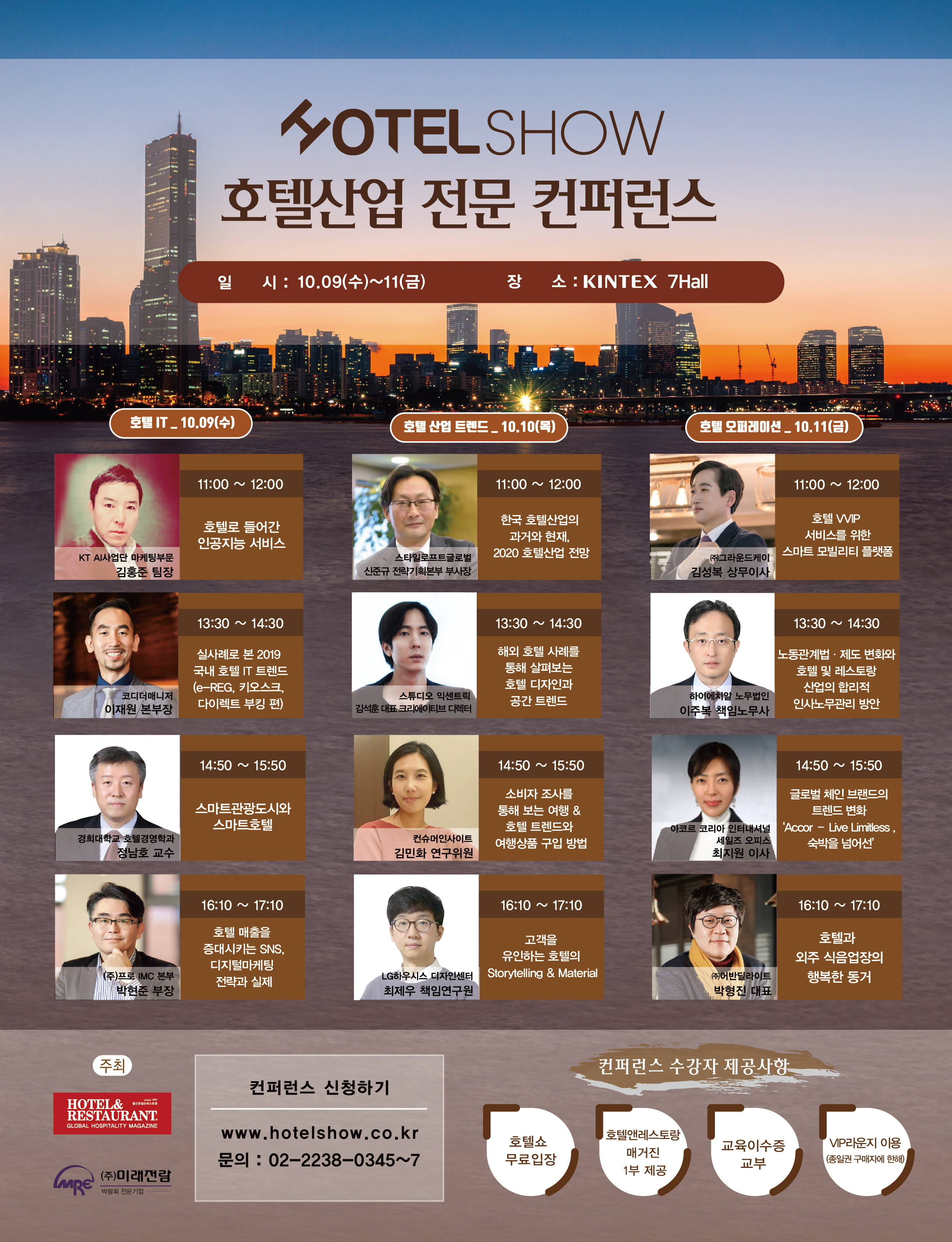 호텔/숙박산업에 대한 개발,운영,영업,마케팅과 미래 트렌드에 대해 심도있는 전문가 강연이 이뤄지니 많은 관심 및 참여를 부탁 드립니다.